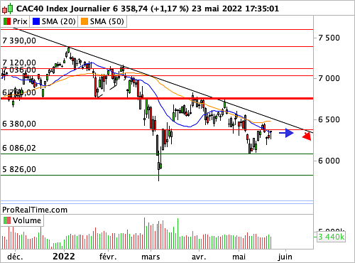 (BFM Bourse) - Toujours sous une droite oblique à forte pente baissière (en noir sur le graphique journalier), l'indice CAC 40 dispose encore d'une courte marge de rebond technique, dont il ne s'est pas privé hier, certes dans des volumes bien timides, dans le sillage de Wall Street, ragaillardi par deux sorties de Joe Biden: