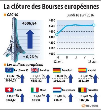 À Paris, le CAC 40 a fini sur un gain de 0,26% (11,67 points) à 4.506,84 points. Le Footsie britannique a pris 0,15% et le Dax allemand 0,68%, tandis que l'indice EuroStoxx 50 gagnait 0,32% et le FTSEurofirst 300 0,42%.