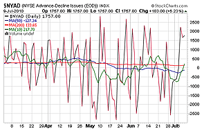 >> Les LIGNES ADVANCE-DECLINE: Probablement l'indicateur le plus optimiste pour cette semaine.La ligne verte (moyenne mobile 10 jours) fait un énorme saut dans la zone positive. En même temps elle croise les deux autres vers le haut: signe très bullish ('golden cross').