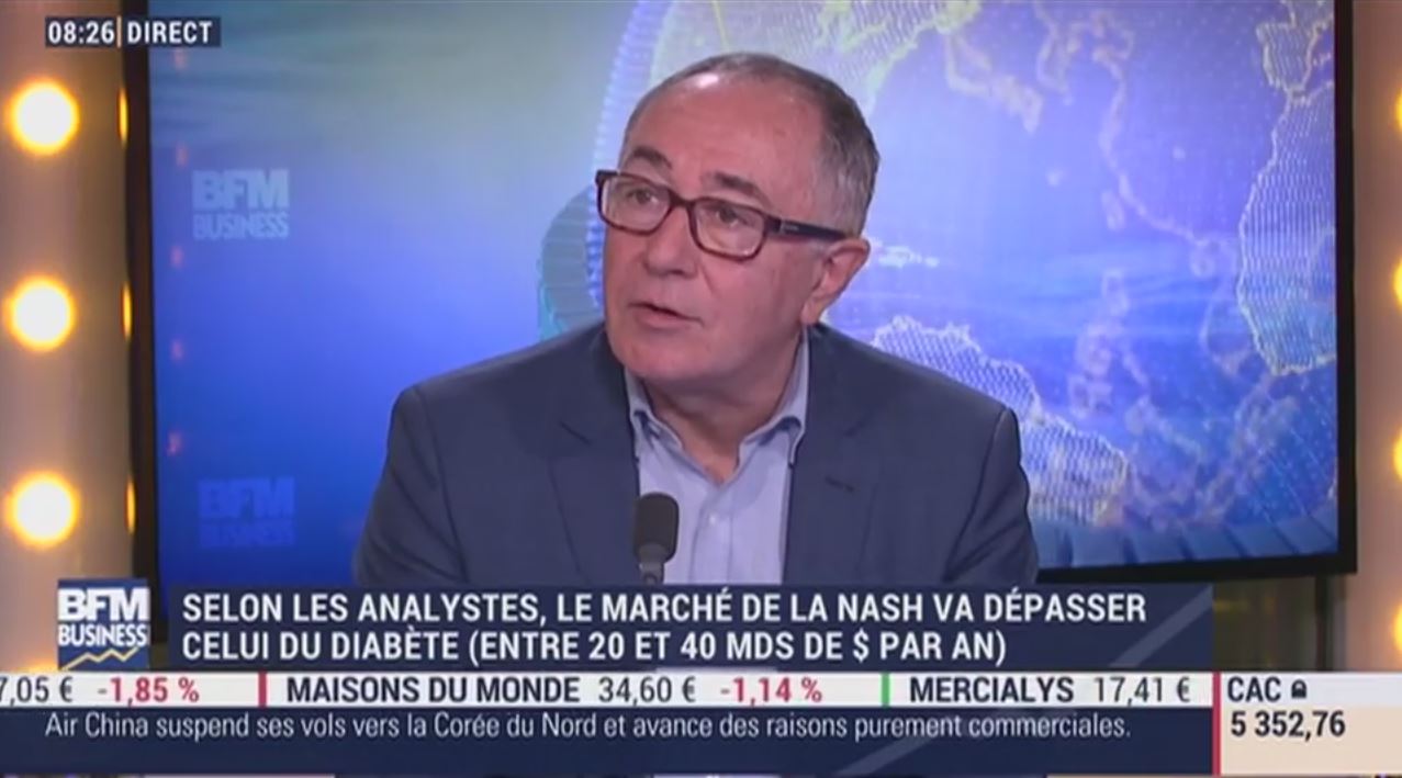 (BFM Bourse) - La course au premier traitement de la "NASH", maladie qui associe une accumulation de graisse dans le foie, une inflammation et une dégénérescence des cellules hépatique s'est considérablement accélérée en peu de temps. En pointe dans le domaine, la société biopharmaceutique Genfit fait face aujourd'hui à une compétition accrue. "Nous étions trois ou quatre sociétés il y a un an ou deux [...], il y en 50 voire 100 aujourd'hui qui sont engagées dans le domaine de la NASH", estime Jean-François Mouney, président de Genfit, qui participait à l'émission Good Morning Business, du jeudi 23 novembre 2017, présenté par Stéphane Soumier, sur BFM Business.