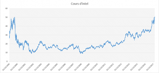 Les actionnaires (les plus patients) d'Intel auront donc dû attendre plus de 17 ans avant de revoir leurs actions dépasser à nouveau leurs plus hauts historiques à Wall Street. En franchissant, mardi, les 51 dollars en Bourse, l'action a battu son précédent record datant du 31 août 2000 à 50,37 dollars. Un record en trompe-l'oeil puisque si le cours de Bourse a effectivement atteint un plus haut historique, la capitalisation reste en revanche inférieure à son plus haut, datant également du 31 août 2000. À l'époque, le géant de la tech était valorisé près de 350 milliards de dollars, contre 235 milliards aujourd'hui.